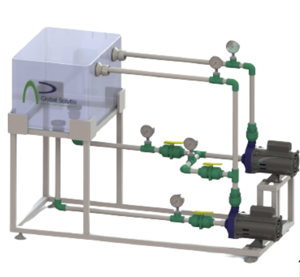 El equipo banco de Bombas Serie-Paralelo diseñado por APGLOBAL SOLUTION, permite comprender las instalaciones de bombas, se pueden conectar en serie o en paralelo dependiendo la necesidad.