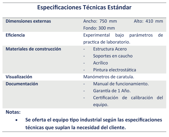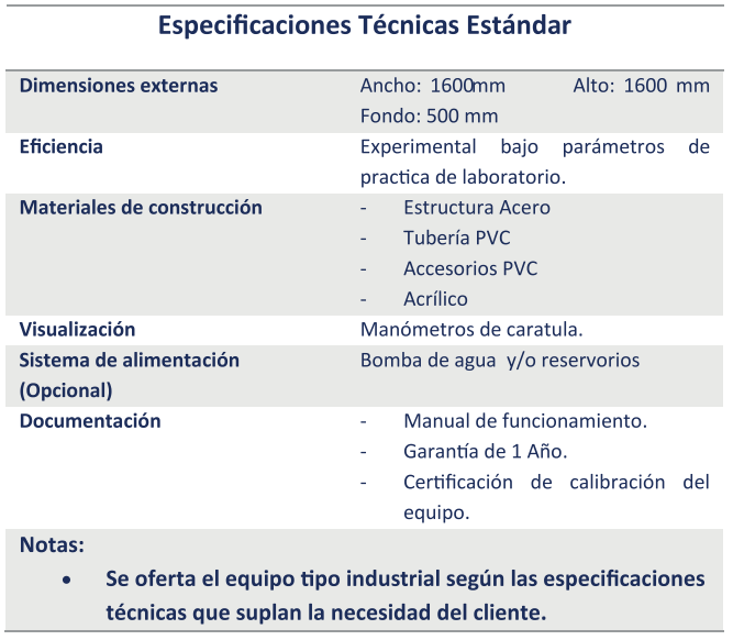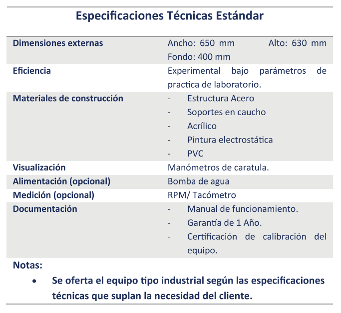 El equipo sirve para estudiar bombas individuales, en conexión en serie y en paralelo, con la finalidad de comprender el fenómeno y poder identificar las ventajas de un sistema al otro, para identificar en qué casos se puede emplear.