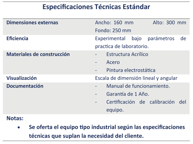 El ángulo de inclinación del depósito de agua se visualiza en una placa frontal de acrílico translucida, para evidenciar de forma clara la inclinación del nivel.