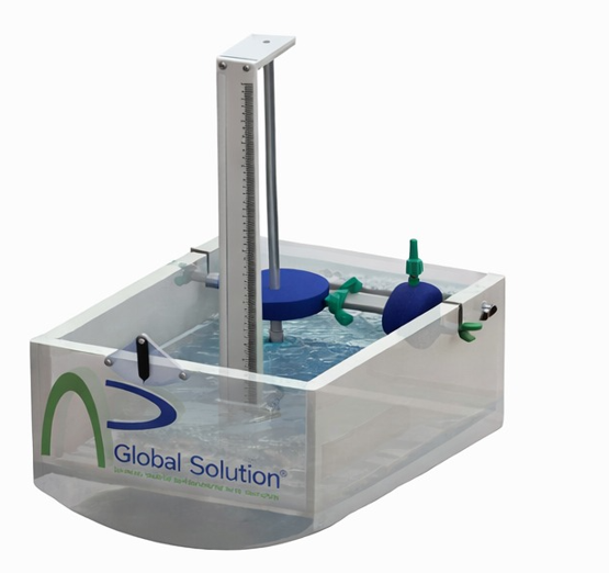 El equipo cuerpos flotantes diseñado por APGLOBAL SOLUTION, permite estudiar la hidrostática, uno de los aspectos fundamentales es conocer el metacentro al momento de evaluar la estabilidad de cuerpos flotantes.